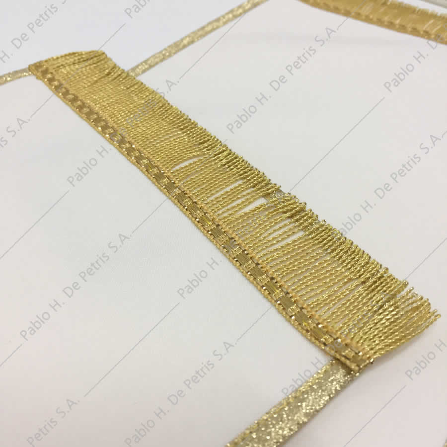 Realizada en tejido sintético. Bordada con hilos dorados y en color en ambos lados.