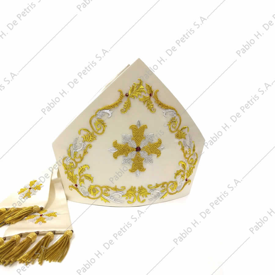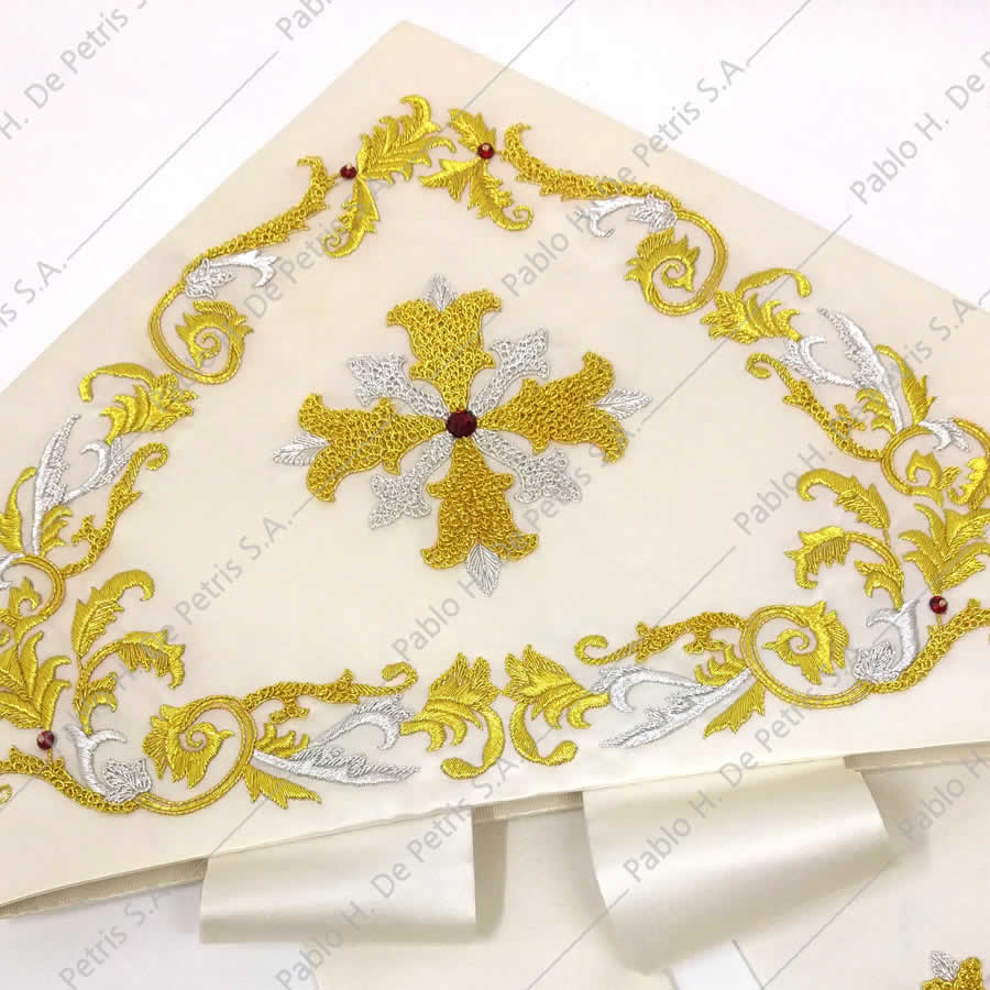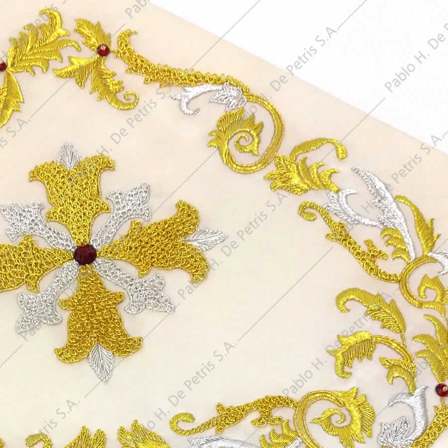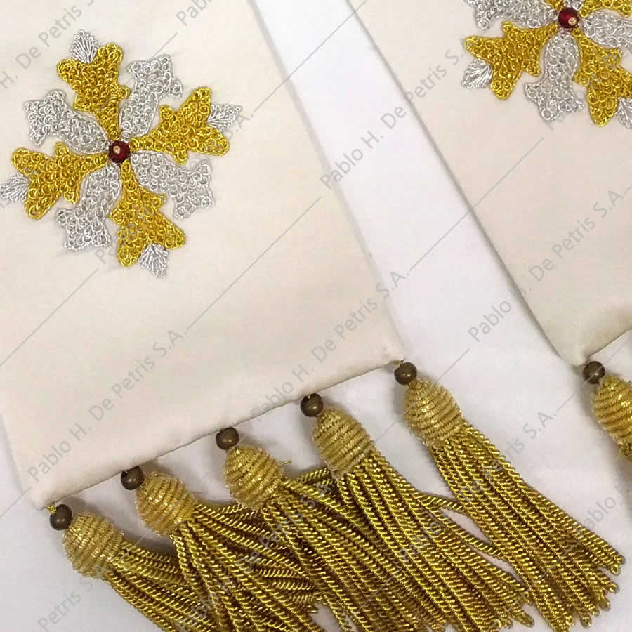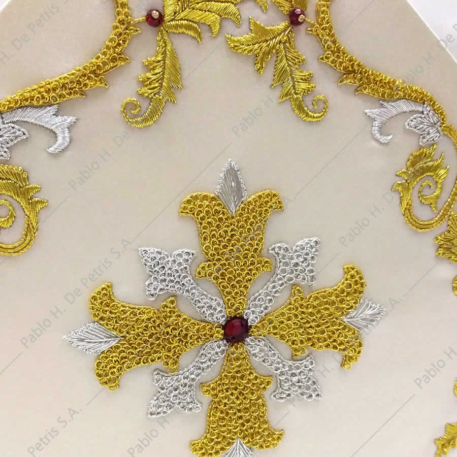 Realizada en seda. Bordada en ambas caras a mano en hilos de oro. Lleva cadenas en color oro y oro viejo. Borlas hechas a mano.