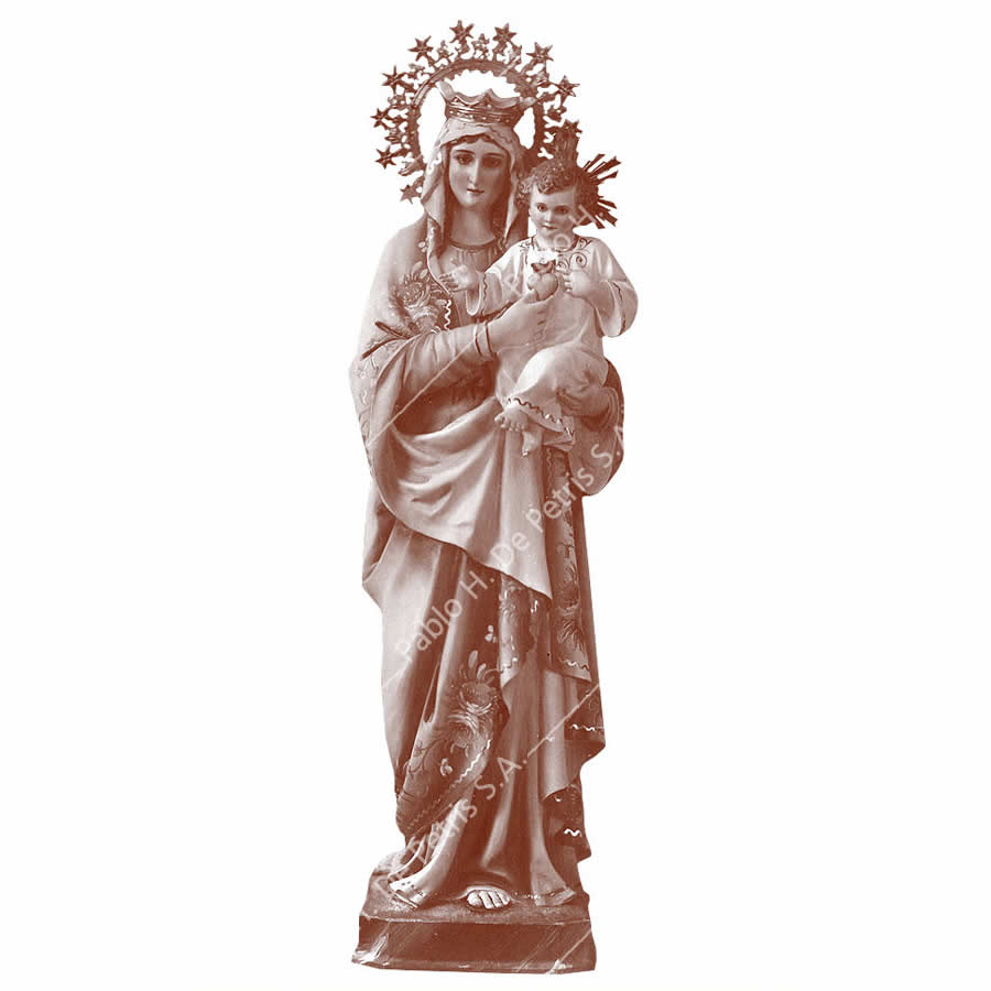 Imagen realizada en pasta madera y pintada a mano al óleo en sus colores tradicionales. Ojos de cristal. Aureola de bronce.