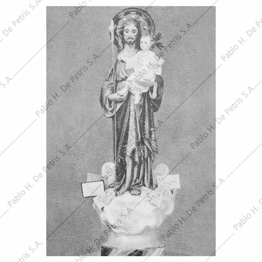 Imagen realizada en pasta madera. Pintada a mano al óleo en sus colores tradicionales. Ojos de cristal. Aureola de bronce.