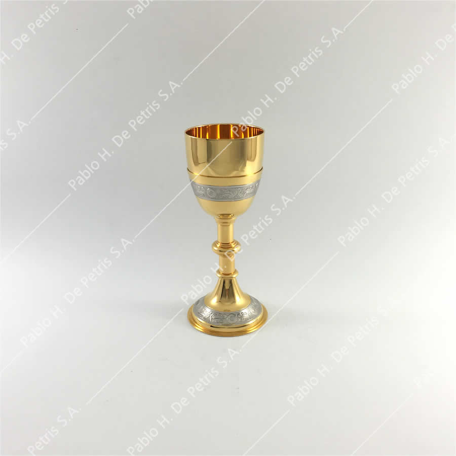 Cáliz realizado en bronce. Interior bañado en oro. Exterior bañado en oro y plata con ornamentación cincelada.