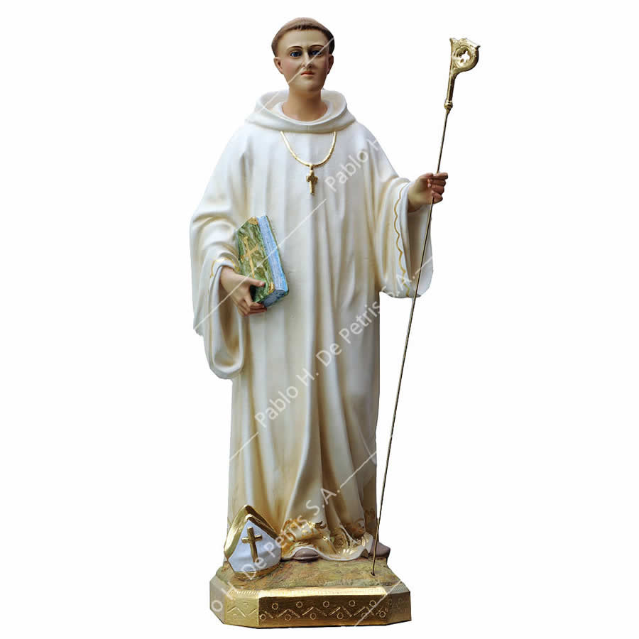 Imagen realizada en pasta madera y pintada a mano al óleo en sus colores tradicionales. Ojos de cristal. Aureola de bronce.