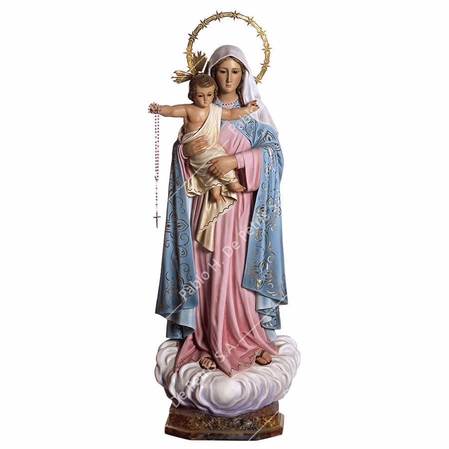Imagen realizada en pasta madera y pintada a mano al óleo en sus colores tradicionales. Ojos de cristal. Aureola de bronce.