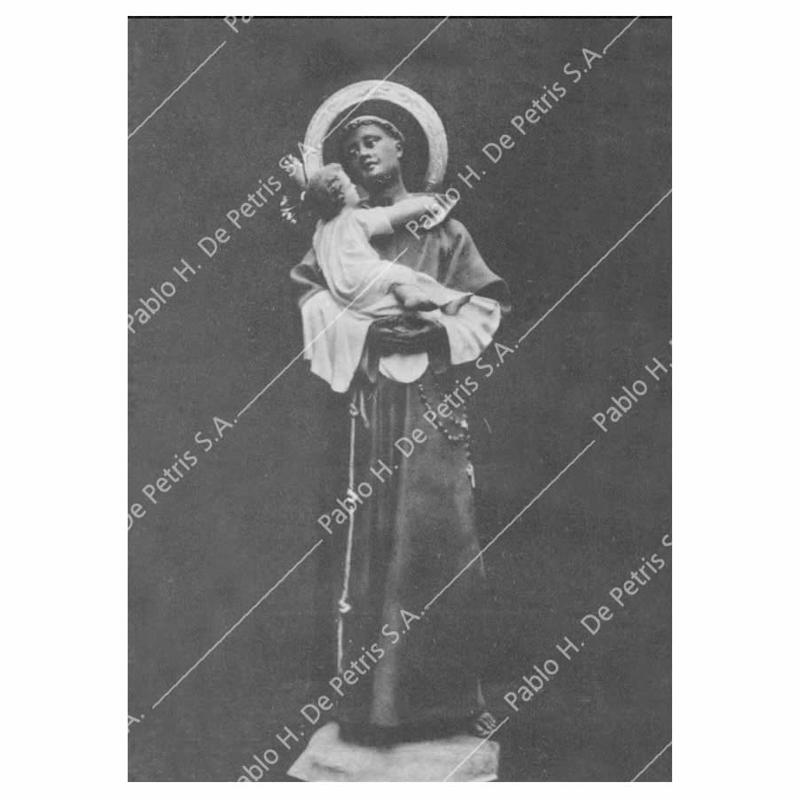 Imagen realizada en pasta madera y pintada a mano al óleo en sus colores tradicionales. Ojos de cristal. Aureola de bronce.
