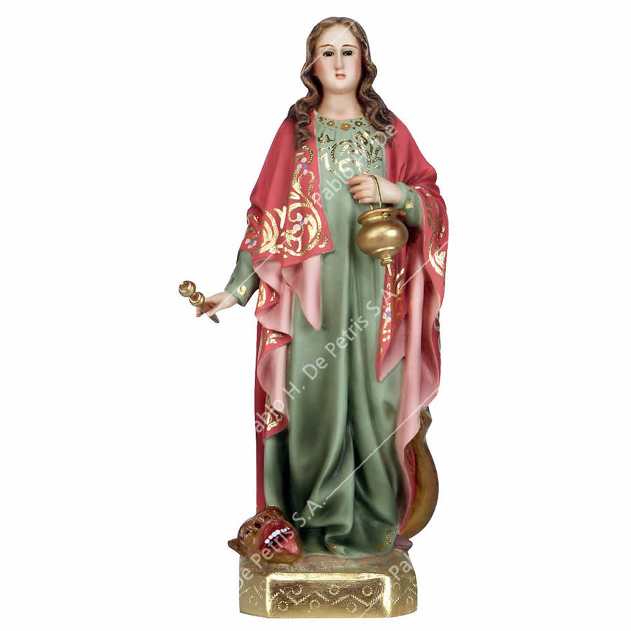 Imagen realizada en pasta madera y pintada a mano al óleo en sus colores tradicionales. Ojos de cristal. Aureola de bronce.
