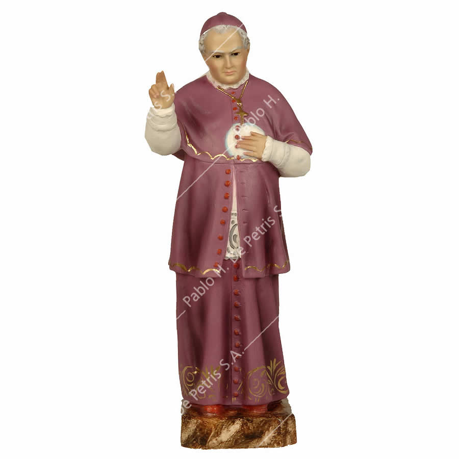 Imagen realizada en pasta madera y pintada a mano al óleo en sus colores tradicionales. Ojos de cristal. Aureola de bronce.