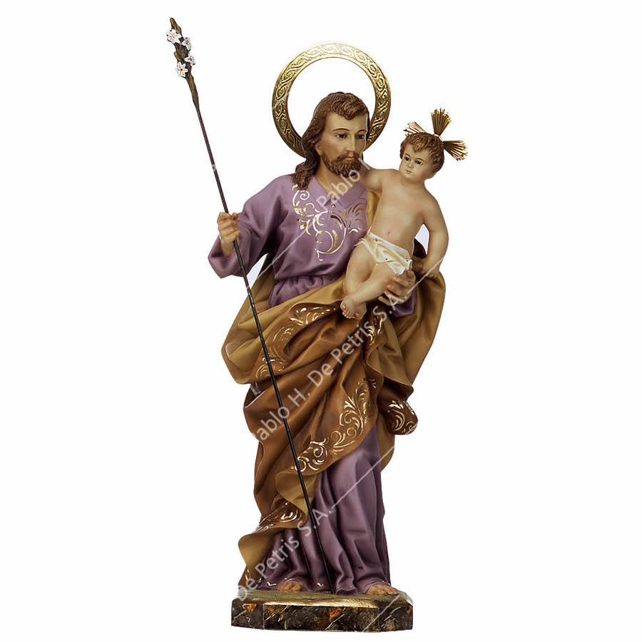 Imagen realizada en pasta madera y pintada a mano al óleo en sus colores tradicionales. Ojos de cristal. Aureola de bronce.