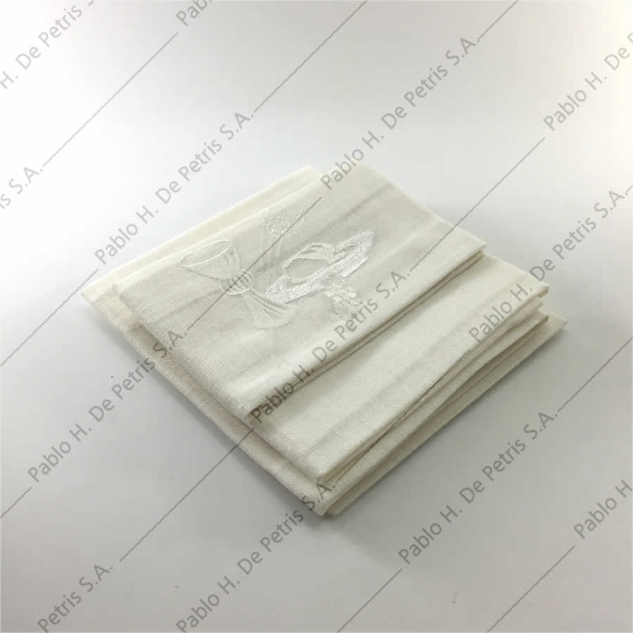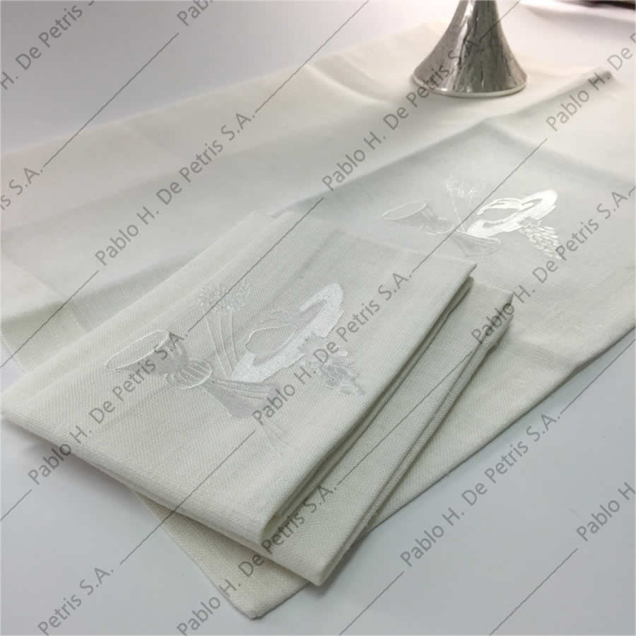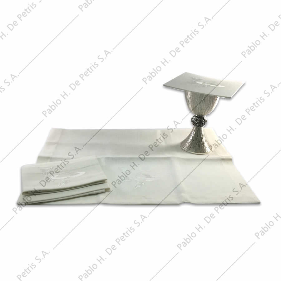 Realizado en mezcla de tejido de lino y sintético con motivo de Pan y Cáliz bordado en palia, purificador y corporal. Incluye: palia rígida, purificador, manutergio y corporal.