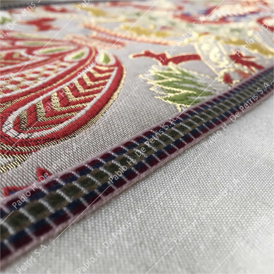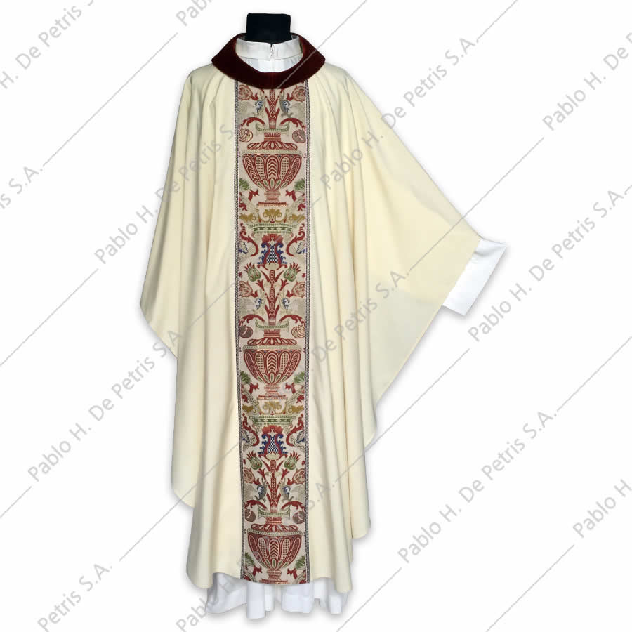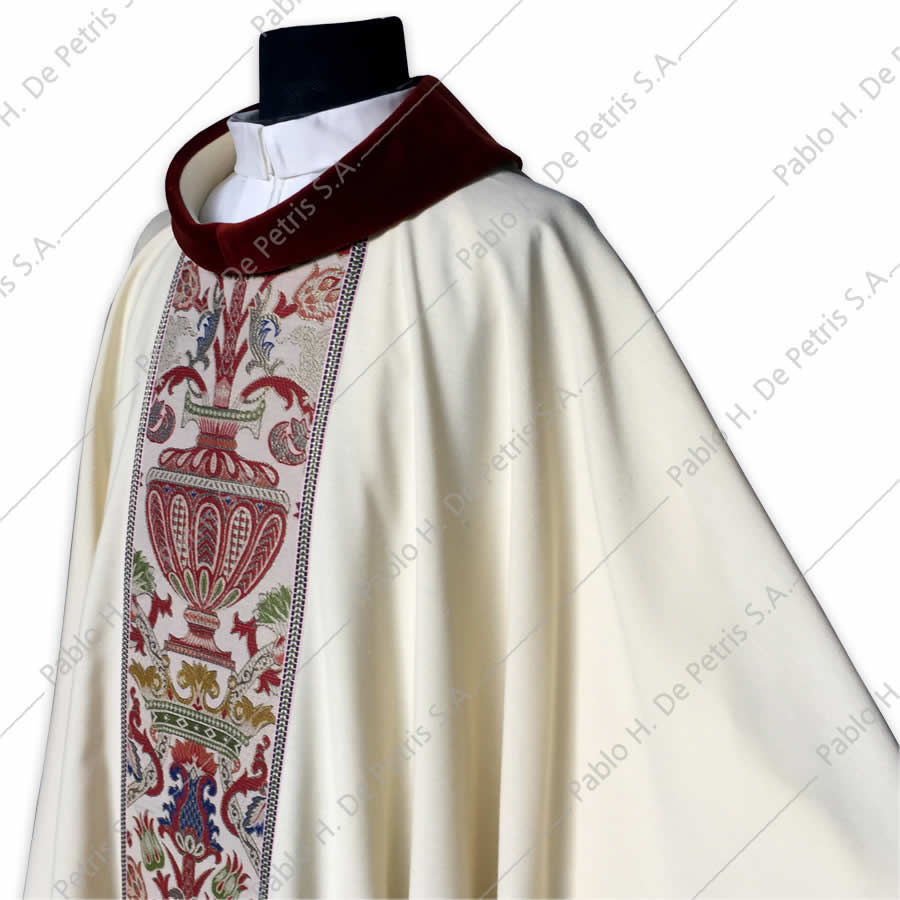 Casulla ornamentada con galón bordado. Cuello de terciopelo.