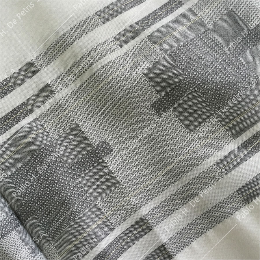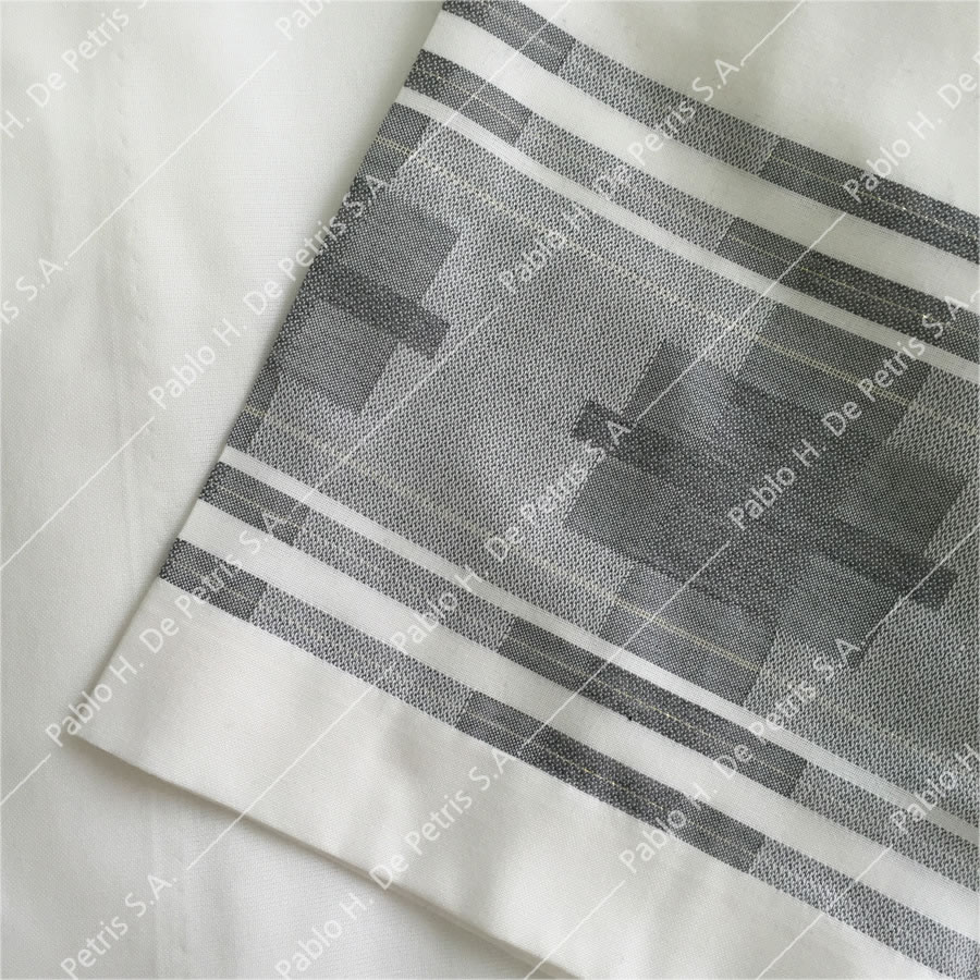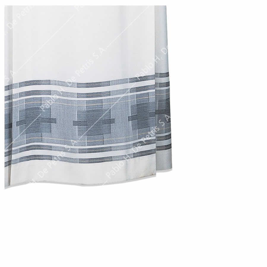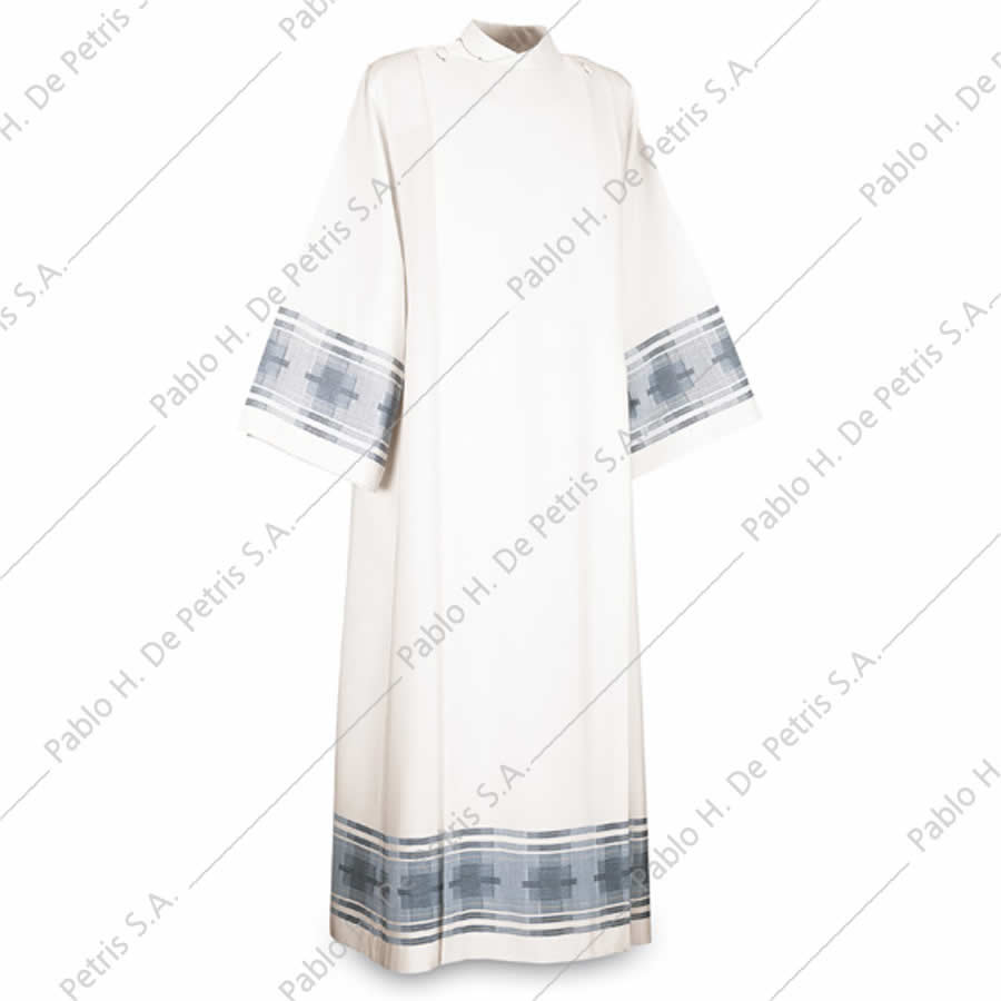 Realizada en mezcla de tejido natural y sintético. Alba sin bordado, ornamentación propia sobre el tejido.