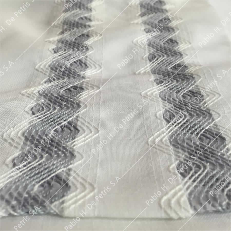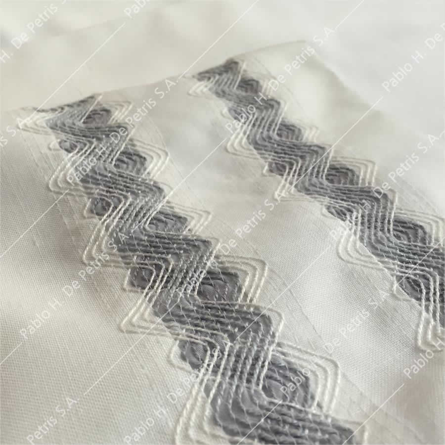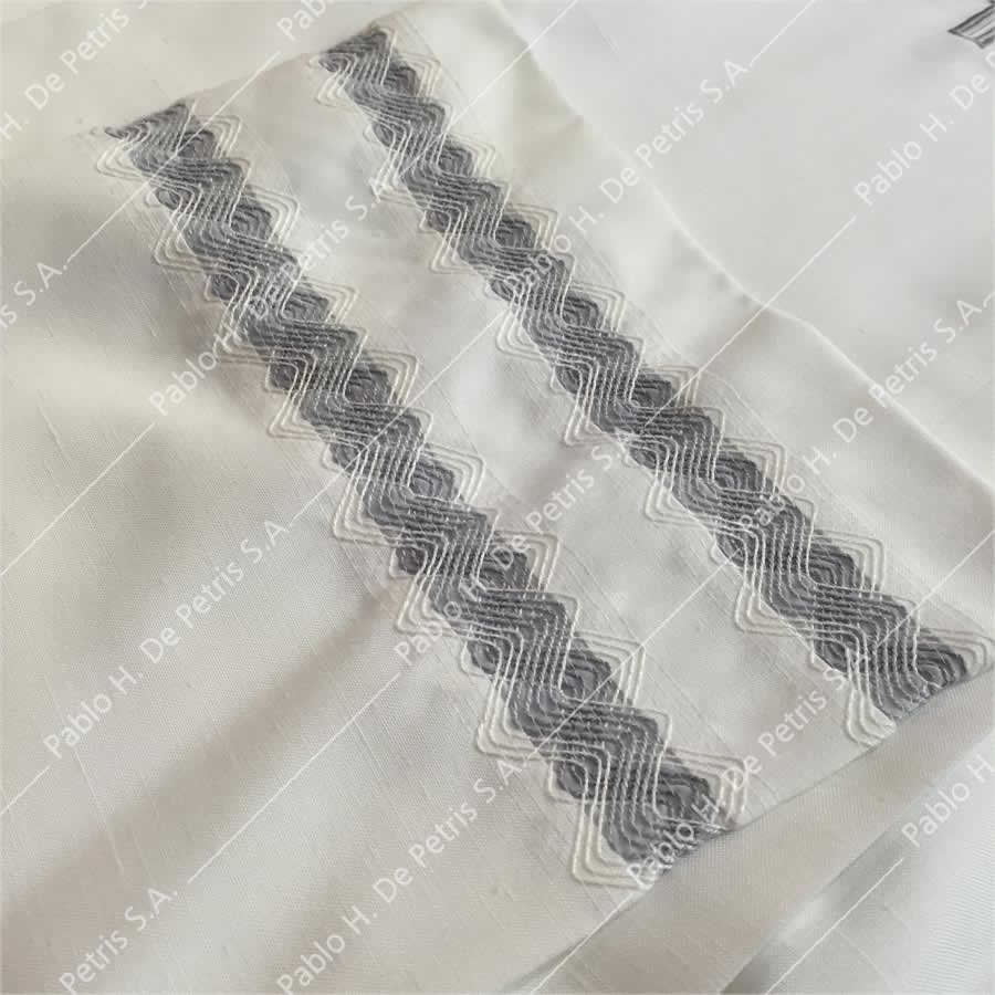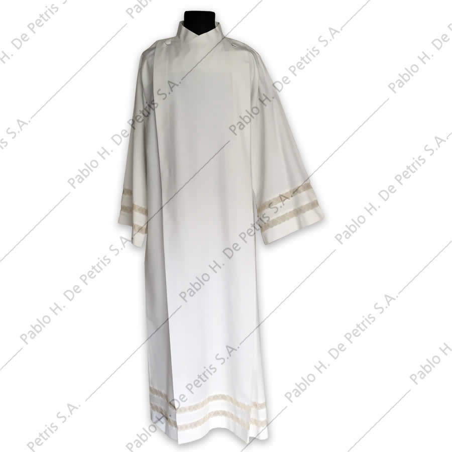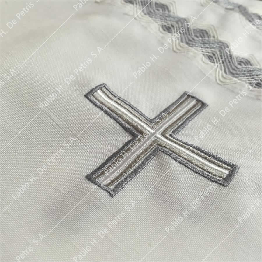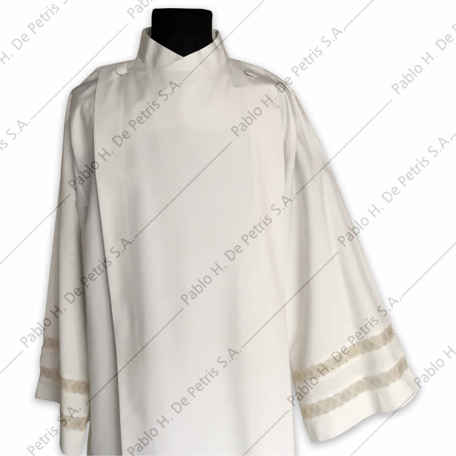 Dos bandas bordadas en color gris y blanco en las mangas y parte inferior del alba.