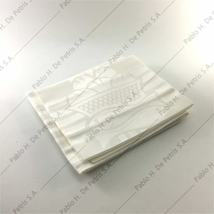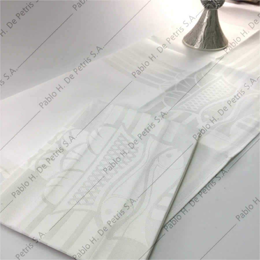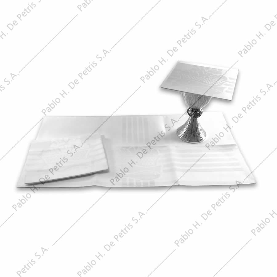 Realizado en mezcla de tejido de algodón y lino con motivo de peces propios en el tejido, sin bordar. Incluye: palia rígida, purificador, manutergio y corporal.
