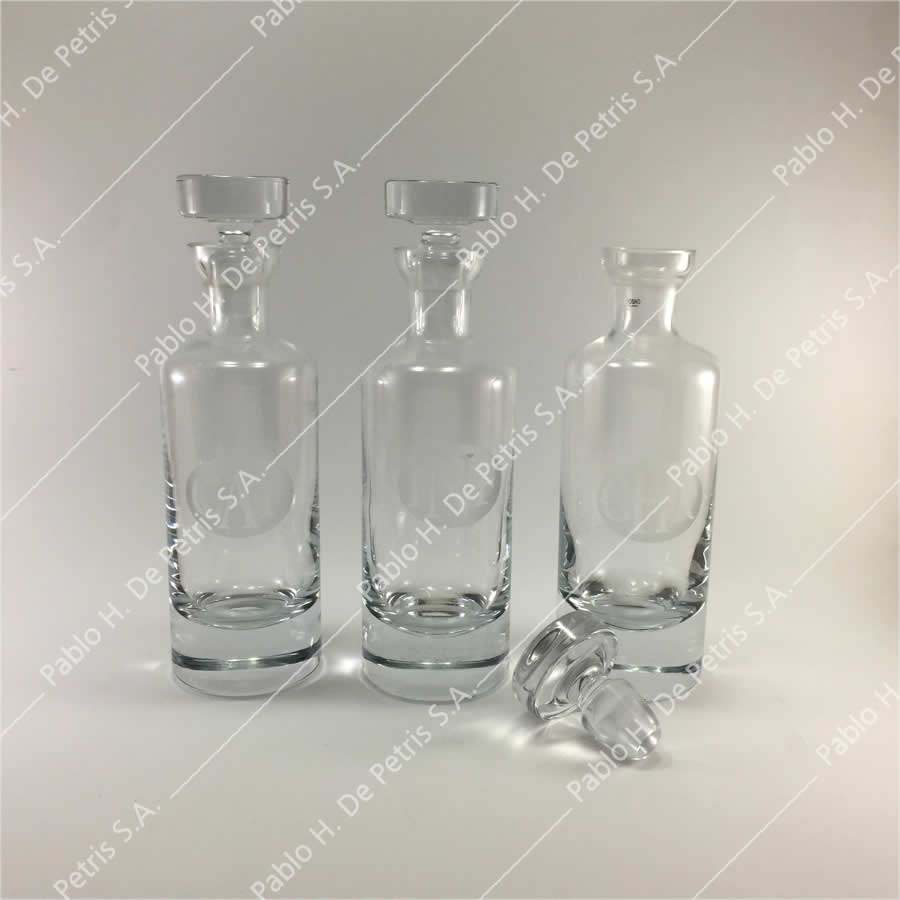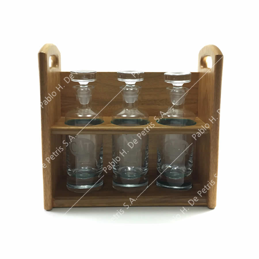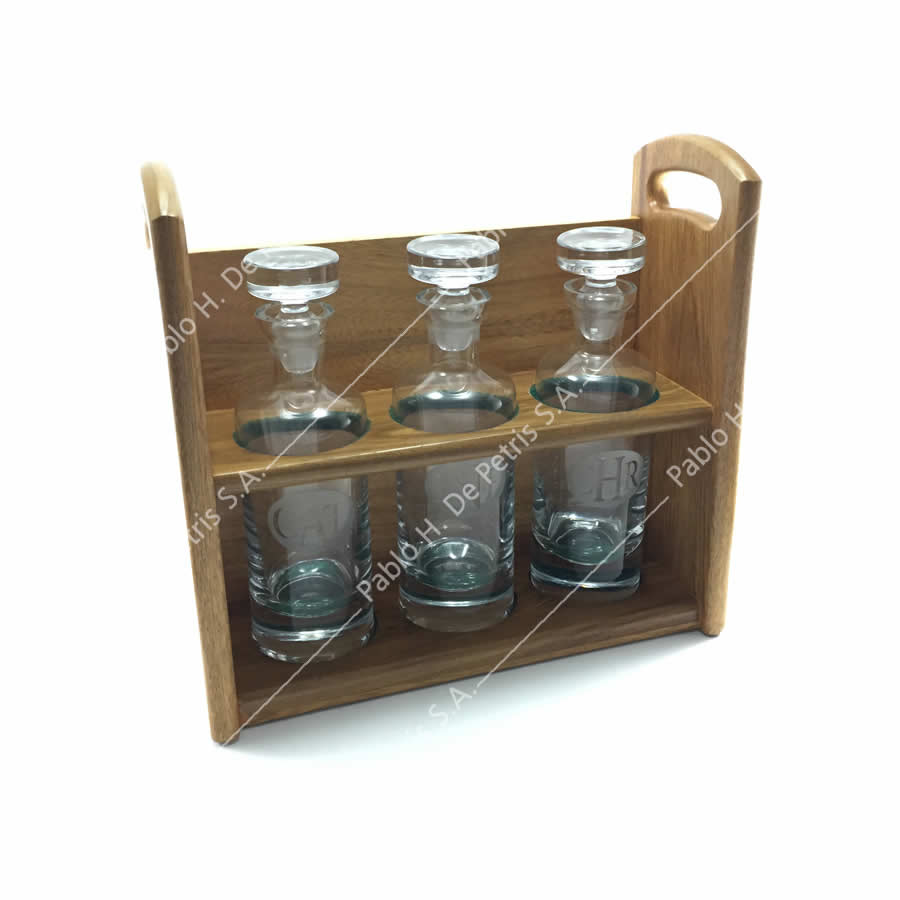 Realizadas en cristal soplado con estantería de madera lustrada. Cada botella incluye la identificación de crisma.
