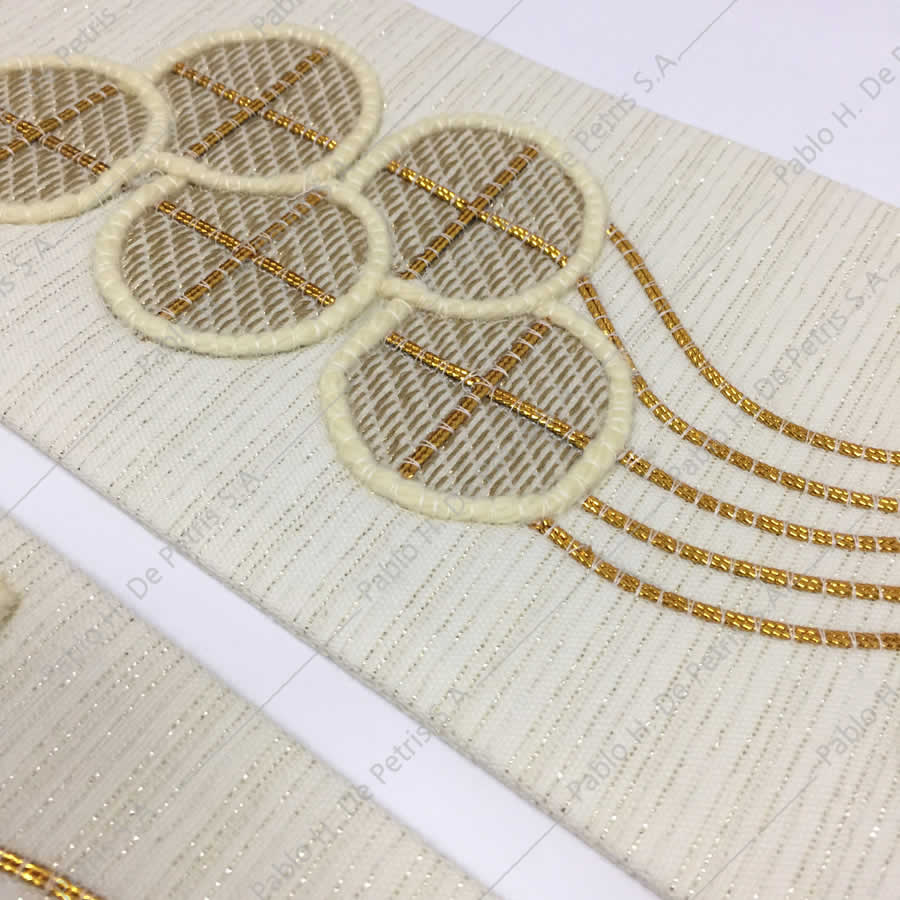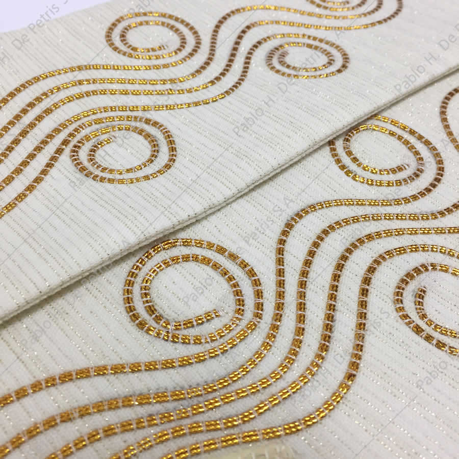Estola con apliques bordados. Realizada en lana y lurex. El tejido presenta hilos dorados interlados en el mismo.